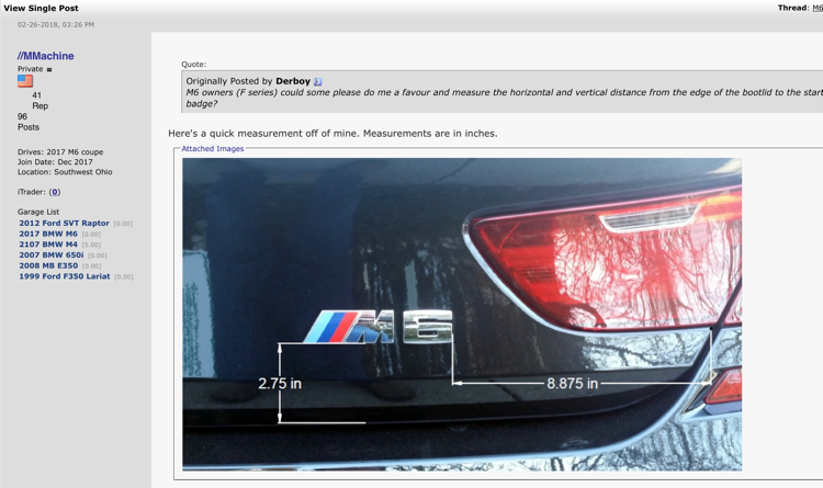 I just bought a 2016 F10 M5 in Sapphire Black. The vehicle is missing its rear bootlid 'M5' decal. I have the OEM replacement badge but, given that the vehicle is missing its original nameplate, I do not have a guide to mark-out the correct position using tape. I have searched high and low but, the only information readily available is 'How to…' replace an existing badge. No data exists detailing the number of mm the badge should be from the right edge of the bootlid or how far above the lower edge above the license plate it should be. I am also unable to find a local vehicle to measure it! If anyone could take accurate distances from their machine, it would be greatly appreciated. Or, if anyone has BMW info on it, that would be great. Ideally, this is the type of info I'm after: https://www.bimmerpost.com/forums/sh...php?p=22838742 Hopefully someone can help.. Thanks in advance. ![]()