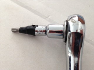 build this yourself with a 1/4 socket at the torx head. if you have 1/4 ratchet it would be easier. I used a 1/2 ratchet and built this, worked ok but 1/4 ratchet would be better (smaller) P.S the black tape is there to hold the torx head in the socket!! |