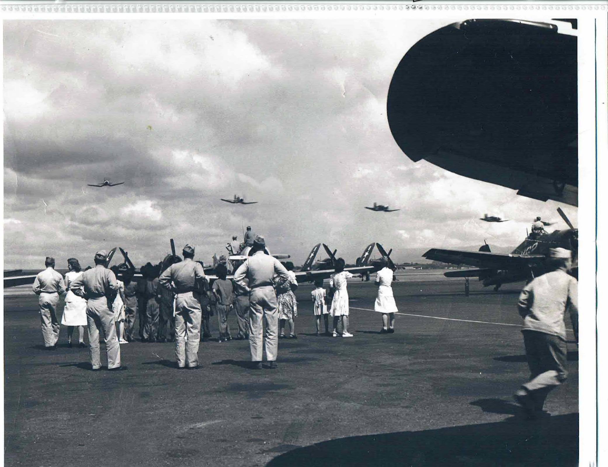 I think I know the feeling in that last photo -- in the spring of 1960, my Dad flew off the Midway with his squadron (12 planes or so) the day before the ship got to Alameda. The flight line was crowded with families waiting for their dads as the whole air group arrived -- F3H Demons, F8U Crusaders, FJ Furies and AD Skyraiders. As a 13 year old, I remember an intense feeling of pride to see my Dad lead the squadron in formation to break off, land and taxi up. Pilots climbed down from their steeds and joyous family reunions (after a nine month deployment) ensued. Joy!