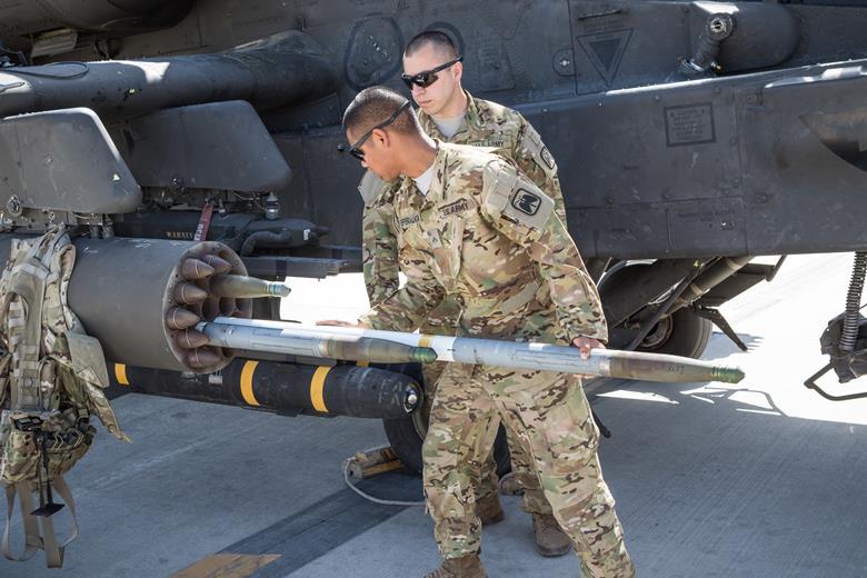 In my earlier post about U.S. air-launched rockets, I failed to note that the vast majority of Western-aligned nations do not use U.S. rockets. The Canadian CRV7 2.75" rocket has become the rocket of choice for most countries outside the USA. The photo is of a UK Apache firing CRV7s.